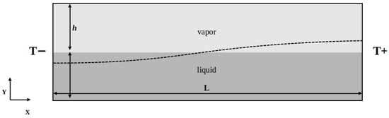 In the present work, the flow domain is a two-dimensional box of dimensions as illustrated in Figure 1. The top and bottom walls are insulated, while the left and right are constant temperature. All walls enforce the no slip velocity condition. The liquid phase is initially at a uniform height h. The initial temperature field is a linear fit between the two temperature boundaries. If present, gravity acts in the negative y direction. When the domain is referred to as “open” this means a symmetry plane was used on the top wall boundary. This allows a velocity component normal to the boundary and acts as a von Neumann boundary for all other variables. This was chosen to more closely match the analysis and resulting expression from Sen and Davis [] who considered the single-phase problem. When the domain is referred to as “closed” the top wall boundary is another non-slip wall.
