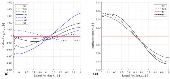 Interface height in different scenarios, constant Ma number 633, predictions from STAR-CCM+. (a) cases with small deformations, (b) cases with large deformations, S5 included for visual reference only. Note the difference in scale on the y-axis.