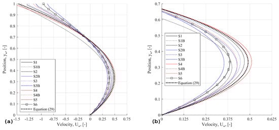 In Figure 5, the velocity profiles from each scenario are plotted together with a constant Marangoni number as described in Table 2. With the left view, each scenario follows the same parabolic trend with increasing height. In the right view, the difference between scenarios is more clear, but there is no obvious grouping. All scenarios have their peak velocity at the maxima of (29) as , except for S2, S3, and S3B, which are closer to . The maximum ranges from in S4 down to in S2B.