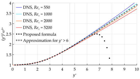 Note that Equation (7) is designed for use only within the viscous sublayer. If the value of exceeds 6, some other form of expression for should be adopted, e.g., , which is shown in Figure 1 with open symbols. In the simulations presented below, however, was always lower than 6 at the points where was prescribed, which allowed to use the Equation (7) without any extensions.