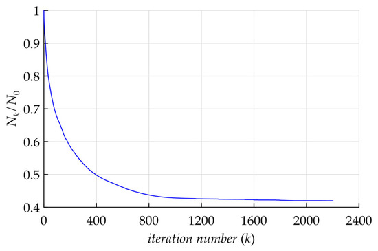 The typical behavior of the iterative process is shown in Figure 2; the difference norm (8) dependence is divided by its initial value on the iteration, the number is shown. Note that the initial value corresponds to the Jakirlić & Maduta model [24].