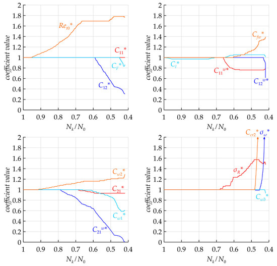 More than half of the coefficients experienced a substantial change. The coefficient , which is used in the slow part of the redistribution term, was decreased by almost 70%; , which affects the region where low-Reynolds number corrections are active, had an increase by 77%; and , which define the amplitude of the near-wall corrections to the slow part of the redistribution term, decreased by 20% and 38% correspondingly. is close to zero after the calibration, which means that the near-wall correction to the rapid part of the redistribution term is essentially turned off. and , which are responsible for the production and destruction of , were reduced by 40% and raised by 29% correspondingly. This imbalance is towards the destruction of was compensated by a heightened value of the cross-diffusion coefficient , which became 17.2 times that of its initial value. Finally, the coefficients and , which are inversely proportional to the intensity of the turbulent diffusion of and , noticeably grew by 48% and 2.5 times correspondingly. The change in coefficients during the difference norm decrease is presented in Figure 3.