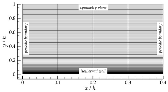 This subsection considers the developed turbulent channel flow at a Mach number 0.2 calculated by the bulk velocity (nearly incompressible flow). The basic computational grid contained cells, and the wall-adjacent cell height in inner variables was chosen as . A half of the channel from the wall up to the symmetry plane was modeled. A general view of the grid and boundary conditions is shown in Figure 4. In the coordinate system of the figure, the flow is moving from left to right.