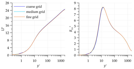 To investigate the grid convergence, nested grids obtained through a consecutive twofold refinement of the base grid in the wall-normal direction were used. In Figure 5, the mean velocity and Reynolds stress profiles obtained on these grids with the modified model are shown. It can be seen that the solutions almost coincide.