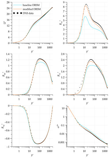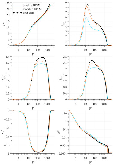 Consider the wall-normal boundary layer parameter profiles extracted from the control section at (Figure 9). The DNS results [39] were used as the reference data at the same value of . It can be seen that the modified model improved the velocity distribution compared to the baseline model within the boundary layer. The Reynolds stresses and parameter distributions also approached the reference data, especially for the inner peak of .
