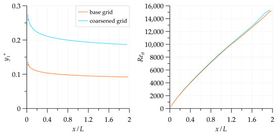 The main grid contained cells. The wall-adjacent cell height in inner variables was within (Figure 8, left, “base grid”). To perform the grid convergence study, simulations were also carried out using the modified model on a grid obtained by removing every second grid line from the original one. It was found that in the interval , the streamwise distribution of the local momentum-thickness Reynolds number is reproduced on the two grids within a 1.5% difference. The solutions deviate from each other more noticeably only at due to the outlet boundary condition influence (Figure 8, right). Note that by definition, , where , , are the freestream velocity, density, and dynamic viscosity, respectively. Momentum thickness is expressed as