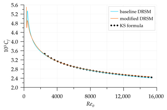 Streamwise distributions of the friction coefficient along the plate , obtained in the simulations and plotted as functions of , are represented in Figure 10. They are compared with the Karman–Schoenherr (KS) empirical correlation [41]: