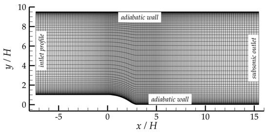 The Jakirlić & Maduta model [24] with baseline and modified sets of coefficients were implemented in an in-house CFD code zFlare [36]. In this program, using the finite-volume method, the complete system of Reynolds equations for a compressible gas is solved with the possibility of RANS/LES hybridization. Multiblock structured grids and an implicit time integration method DIRK22 (Diagonally Implicit Runge–Kutta Method, two stages, 2nd order of accuracy) [37] are used. In RANS simulations, the spatial approximation of convective terms was performed according to the WENO5 scheme (Weighted Essentially Non-Oscillatory, 5th order) [38] along the grid lines. For diffusion and source terms, 2-nd-order-accurate central difference formulas were used. To verify the software implementation of the models, the results of developed channel flow simulations at using the zFlare program were compared with the results obtained from the auxiliary one-dimensional program calculation. This program was used in the calibration process. The computational grids corresponded to each other. Solutions for both the baseline and the modified models turned out to be practically indistinguishable between the two programs; the relative divergence in the mean velocity and Reynolds stresses profiles were within . After this verification, the simulations described below were performed.