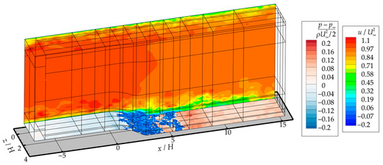 The grid for hybrid RANS/LES simulations was obtained by extruding the RANS grid described in Section 3.3 in -axis direction by 96 cells, with the total width of the computational domain in this direction equal to , and by coarsening the grid twofold in the XY-plane. On the side planes, a periodic boundary condition was specified. At the inlet boundary, unsteady disturbances were superimposed on the profiles of the flow parameters according to the method [46], which quickly switched the simulation to the scale-resolving mode. In contrast to RANS simulations, spatial approximation of the convective fluxes was done using the hybrid scheme, which blends the upwind WENO5 approximation in the RANS sublayer and the 2-nd order central differences in the LES region using the formula proposed in [47]. The time step was equal to , where is the characteristic time of the flow. The period of flow settling was chosen to be equal to , after which the solution was averaged over a period of time . For illustration, an instantaneous flow field is shown in Figure 13, which was obtained in the hybrid simulation with the recalibrated Jakirlić & Maduta model in the RANS sublayer. It can be seen that an isolated separation is formed near the channel expansion region.