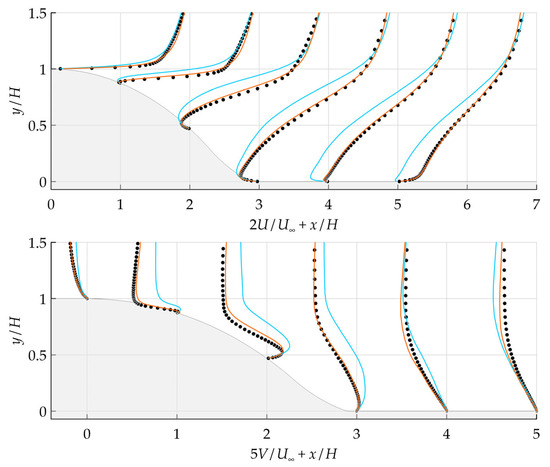 Mean streamwise (upper) and transverse (lower) velocity profiles. Hybrid simulation with the baseline model in the RANS subregion (blue line) and the modified model in the RANS subregion (orange line). Black symbols correspond to reference LES. Step geometry is shown in grey.