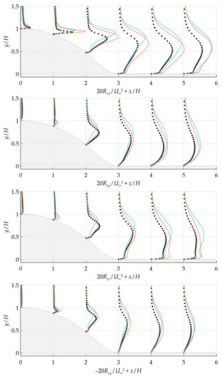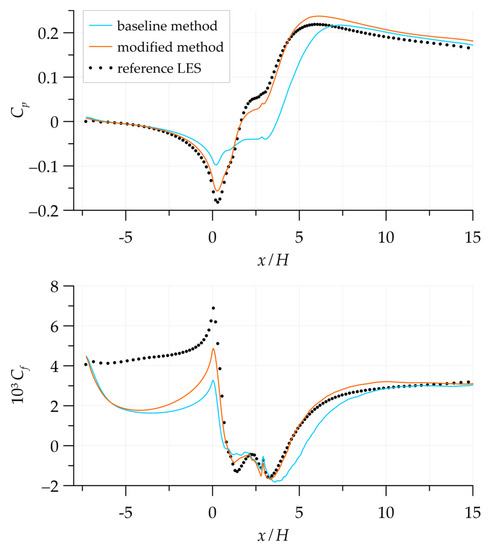 Figure 14 shows the profiles of streamwise and transverse mean velocity components obtained in the hybrid simulations. It is seen that, in contrast to the pure RANS setting, switching to the modified model reduced the size of the separation region to the reference value and caused almost complete agreement with the reference data on the streamwise velocity component. Only minor differences remained visible in the field of the transverse velocity component.