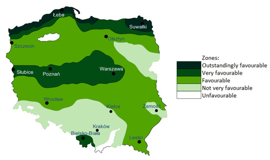 On the basis of long-term observations of wind parameters by the Institute of Meteorology and Water Management, the wind map of Poland is created and continuously updated (Figure 1) [11]. It includes the division of the country into areas of different wind conditions marked by different colours, indicating which areas are favourable or not for the location of wind farms.