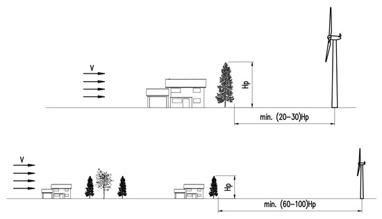 Recommended location for a wind turbine behind a single obstacle or several obstacles.