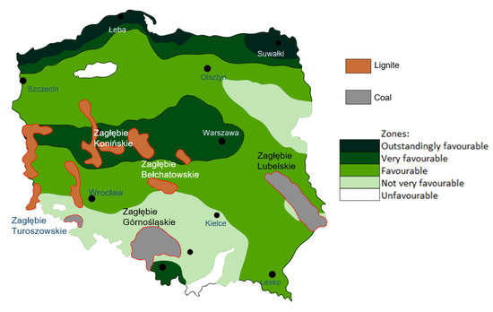 Taking into account the wind conditions in the areas of mining heaps, it can be concluded that the best conditions for the construction of wind farms are in the Konin Brown Coal Basin (Zagłębie Konińskie), and slightly worse conditions are in the Bełchatów Coal Basins (Zagłębie Bełchatowskie) and Lublin Hard (Zagłębie Lubelskie). The Upper Silesian Basin (Zagłębie Górnośląskie) has the worst wind conditions (Figure 3).