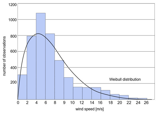 The average wind speed results strictly from its distribution described by the probability density function. The histogram shown in Figure 4 is an approximation of this function. Using the calculations made while plotting the histogram, it is possible to determine the average wind speed Vav according to the following relationship: