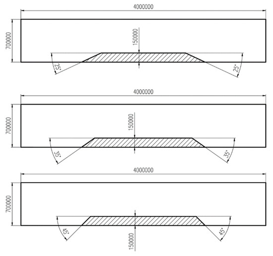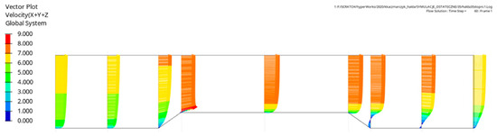 The accumulation of lines on the edge of the upper slope, under the pressure of the wind, is observed in the analysis of the wind streamlines’ distribution. The greatest accumulation is in the heap with the greatest slope angle (45°). The analysis of the streamlines at the flattened surface of the heap top shows no differences in their trajectories. For more information, see the wind contour maps (Figure 9). On the wind speed contour maps, different speed zones behind the top edge of the heap can be seen. The greater the slope inclination of the heap, the more areas of different speeds are present, which indicate the presence of air turbulence in these places, and thus unfavourable conditions regarding the efficiency of a future wind power plant installed there. Based on the contour maps for the considered example, it was estimated that the elevations of this turbulence area for the slope angles 25°, 35° and 45° are, respectively, 23 m, 43 m and 102 m. From the wind speed contour maps, it can also be observed that an artificial elevation such as the mine heap caused an increase in wind speed (above 7 m/s), not observed in front of the hill. Additionally, the greater the slope angle, the greater the area of the increased wind speed, parallel to the ground, that is available at a greater height and further away from the upper edge of the slope. For example, for a slope with a 25° inclination, it was found at a height of 76 m at a distance of 432 m from the edge, and for a slope with a 45° inclination, it was found at a height of 90 m at a distance of 939 m from the edge of the slope. The vectors of wind speed are presented in Figure 10, Figure 11 and Figure 12.