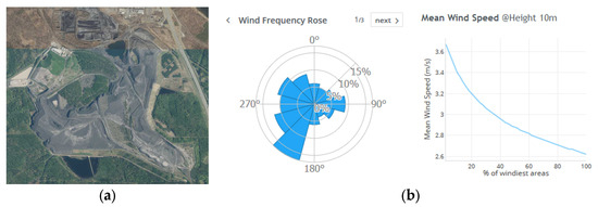 Heap of the KWK Knurów-Szczygłowice mine: (a) satellite image of the mine heap; (b) wind conditions at height of 10 m [15,20].