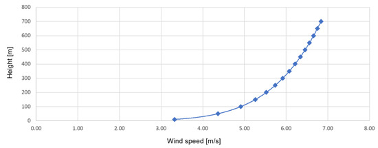 Based on satellite images, the roughness was assumed as class 3 terrain level (woodland, city suburbs), for which the coefficient is α = 0.17. The wind speed, depending on the elevation assumed for the simulation, is shown in Figure 7.