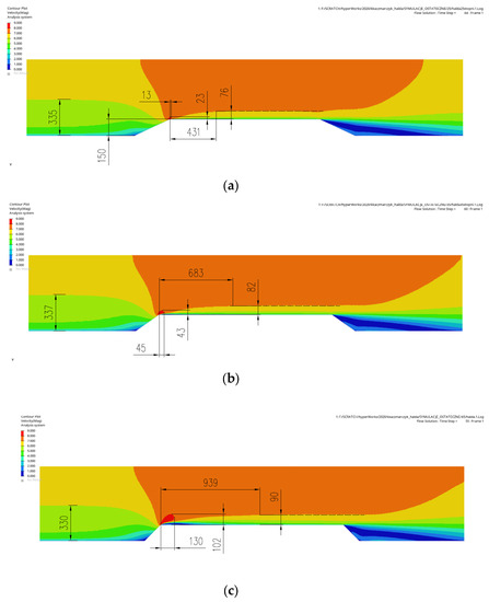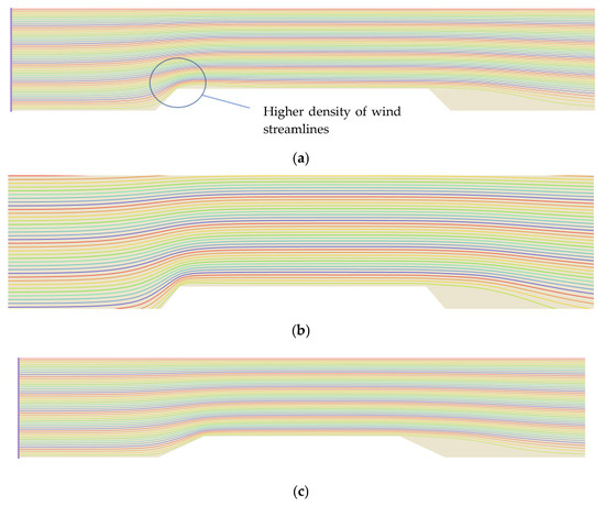 Wind streamlines—numerical simulations: (a) slope inclination of 45°; (b) slope inclination of 35°; (c) slope inclination of 25°.
