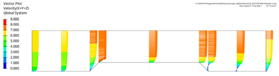 Speed vectors at the selected cross-sections—numerical simulations for slope inclination of 45°.