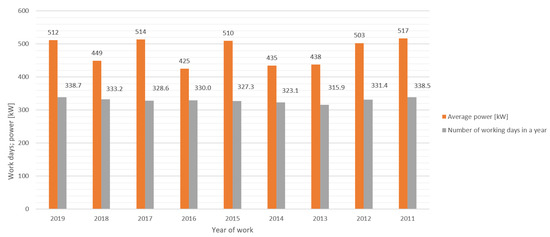A long-term analysis of the wind farm operation shows that over the years, from 2011 to 2019, it operated with an average power of 25.3% of the maximum power on about 330 days a year. These are very good operating parameters, undoubtedly affected by the place where the farm was built, in this case the mine heap. The operation of the wind farm allowed for the production of approx. 60 GWh per year at an average wind speed of approx. 6.3 m/s (Figure 14).