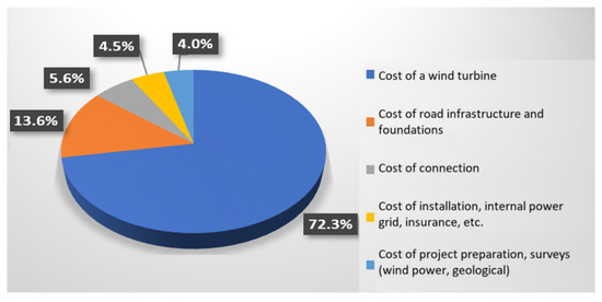 It is estimated that the structure of investment costs in the case of building a wind farm in Poland, per 1 MW of installed power, is as follows: the approximate cost of a wind turbine—77.5%; the construction of road infrastructure and foundations—7.3%; connection costs—6%. Other installation costs, building an internal power grid and insurance are 4.9%. On the other hand, the cost of the project preparation is about 4.3%, which includes the cost of developing the technical design, feasibility studies, environmental reports, wind force measurements, geological surveys, as well as costs of administrative proceedings.