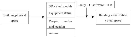 The virtual twin platform is built on the basis of the three-dimensional building model. The building’s geometric size, style, and structure will be rendered using 3ds max, and the in.fbx file will be obtained and then imported into the Unity 3D engine. At the same time, the texture file is imported to complete the static model mapping. The space-time information and state information need to enter Unity through C# script files to drive the virtual twin model update and complete the dynamic virtual-real mapping. The sensor data accessing function is completed through scripting data, and personnel location, personnel number, and temperature in virtual space are displayed. The flow chart of the virtual twin platform constructed with Unity 3D is shown in Figure 3.