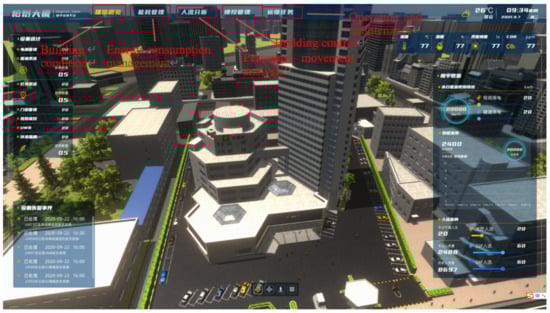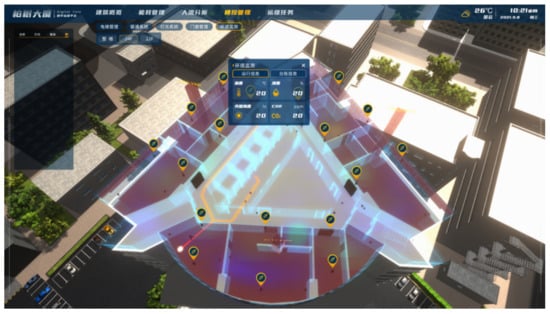 The building devices and spaces of layers 22 and 24 are rendered, and the model is imported into the Unity 3D engine to realize the real-time connection between the virtual twin space and physical space so that the virtual twin platform can be updated continuously. Building a digital twin operation and maintenance virtual platform can realize the display of the building’s internal and surrounding environment, equipment information statistics, alarm list, weather station information, air quality data, building energy consumption statistics, equipment status, and people number and location information statistics. The operation and maintenance interface of the building digital twin virtual platform is shown in Figure 4.
