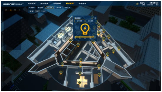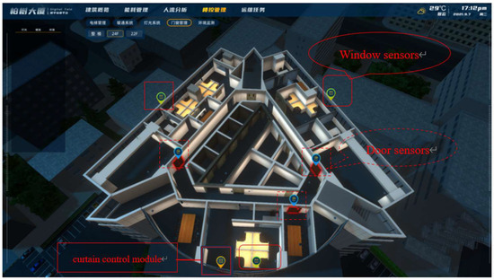Through the door sensor and curtain control module, the status information of doors, windows, and shading can be monitored. And the doors, windows, and curtains can be controlled. According to the number of windows and doors, there are 18 curtain control modules and 32 door sensors for 22 and 24 floors. Through the building’s digital twin platform, the doors and windows can be remotely controlled, and the curtains can be fully closed, fully opened, and half opened. The control principle of the curtain is based on the illumination of the station and can also be controlled with the lighting. The intelligent door, window, and curtain management interface for the 24th floor is shown in Figure 8.