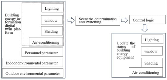 The air conditioning system, lighting system, shading system, and window are the building subsystems which is closely related to the occupants’ behavior. In the operation and maintenance management process of the digital twin platform, the goal is to maximize personnel’s thermal comfort and building energy consumption. The control strategy of a typical situation is developed, and it is realized through the switch of situation combination. The occupants’ usage time and behavior are identified, and the typical situation is summarized. Combined with indoor and outdoor environmental parameters, the air-conditioning load is forecasted, and the fine management of building energy consumption is realized. Intelligent control flow for building energy use is shown in Figure 12.