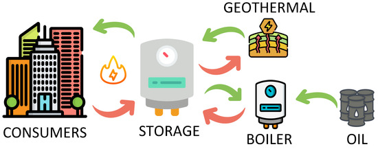 Two energy sources are opted regarding the case study in Lendava: geothermal power denoted with [] and oil boiler power denoted with []. The availability of depends mostly on the geothermal source temperature denoted with [] and water flow denoted with [/]. Also, the power demand is denoted with []. For our model, regarding the case study, the number of energy inputs and outputs can be easily adjusted. The dynamics of the storage water temperature is provided with the following equation: