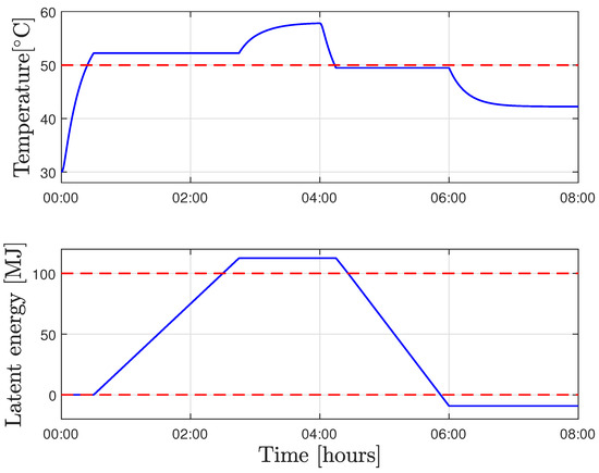In this section, the simulations results of the proposed model are presented, which are comparable to the simulations results of the stratified model from Figure 2. Figure 4 shows that the phase change occurs exactly at the demanded temperature, which is fixed at 50 in this case. Moreover, the latent energy never exceeds the predefined limits of 0 and 100 in this example. The simulation of the model is executed in the discrete domain. The model simulation is executed in the discrete domain because the PCM dynamics include discrete steps. This also makes it suitable for a discrete controller design, such as MPC.