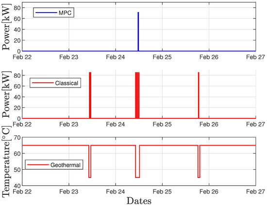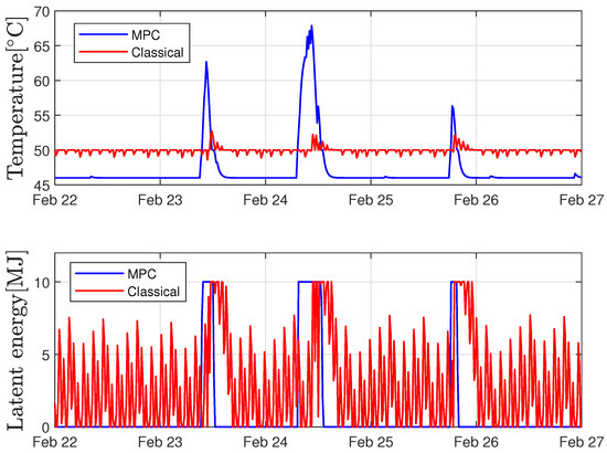 Both control algorithms are tested and compared on 5 days of simulations from the 22nd of February to the 27th of February in 2023. Each day between 00:00–08:00 and 16:00–24:00 are non-working hours, and power demand is 20 . In first three days during working hours, that is, 08:00–16:00, the power demand is 30 , which can be seen in Figure 5 with the green line. During the fourth day, the power demand is 50 , and during the fifth day, it is changeable. In the second graph in Figure 5, it can be seen that MPC uses a geothermal source to follow the power demand by using prediction, and the best tracking is shown on day 5. On the other hand, the classical controller uses the geothermal source in an oscillatory way as it is seen in the third graph in Figure 5, which leads to a shorter life span of the system components due to the frequent ON/OFF switching of the valves and the changing water flow. In the first graph in Figure 5, it is shown that MPC satisfies the temperature constraint by always keeping the water temperature above the minimum of 46 . On the other hand, as it is shown in first graph in Figure 5, the classical control violates the constraint in periods with low geothermal temperature. Due to the lower geothermal temperature, in some periods that are shown in the third graph in Figure 6, the geothermal source is unavailable. MPC anticipates this by using a higher level of the geothermal source one step before. After that, MPC immediately uses all the stored latent energy, while the classical controller is not able to because it does not contain the variable of latent energy in its algorithm as it is presented in Figure 7. In addition, MPC does not use the oil boiler power at all on 23 February and 25 February. However, on the 24 February, the period of geothermal source unavailability is longer, so MPC needs to use the oil boiler power but with a lower amount than classical control as it is shown in Figure 6.