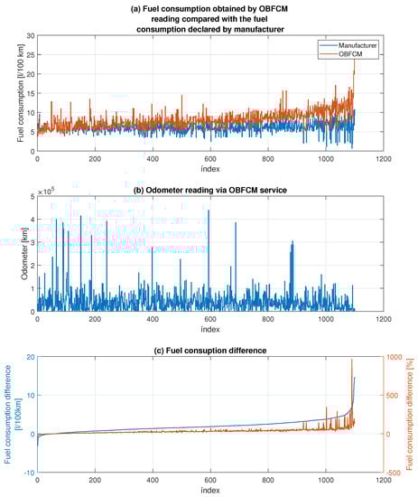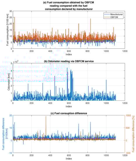 Table 6. It shows that some of the cars have been equipped with the OBFCM device much earlier than required by the authorities; however, the percentage of successful readings before 2014 is quite low, lower than 50%. The overall percentage of data validity is approximately 76%. In the remaining 24%, the data showed the fuel or energy consumption gap by several orders of magnitude; these data were not taken into account in the paper, and only 1100 records of 1434 were considered in the results presented. The resulting fuel consumption gap around 35% corresponds to similar research based on users’ feedback data collection [