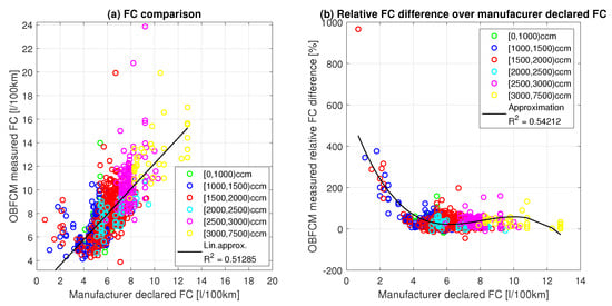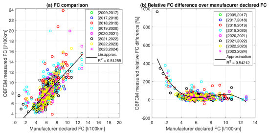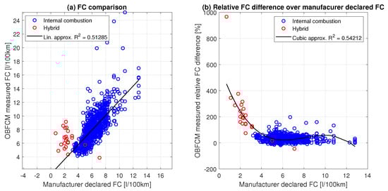 Figure 3 in panel (a) shows the comparison of fuel consumption declared by the manufacturer vs. the fuel consumption obtained via the OBFCM. One can see the hybrid vehicles data mostly in the lower left corner, where almost all of them are above the linear approximation. This indicates that most of the hybrid vehicles presented have a higher fuel consumption than what is declared by the manufacturer. In panel (b) of