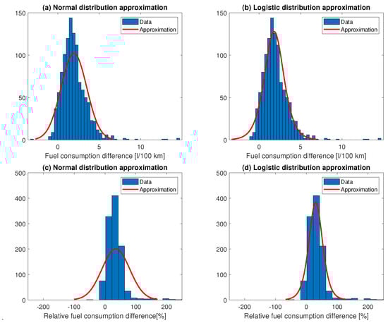 , and panel (d) presents a relative fuel consumption difference histogram fitted by logistic distribution with mean