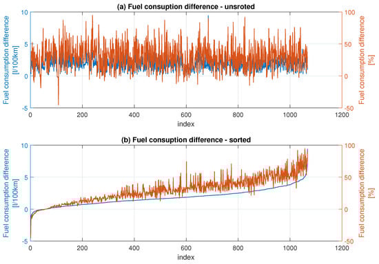 Figure 1, but the data are sorted by the difference in fuel consumption, with the average value of