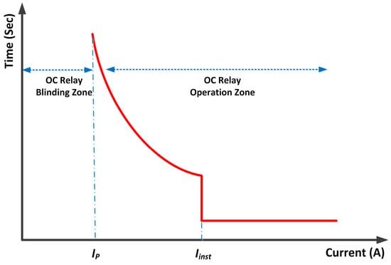 A traditional OC protective relay becomes more challenging with the presence of distributed generation. Figure 1 depicts the conventional OC relay characteristic curve in the operation and blinding zones. The relay has pickup and instantaneous characteristics, which are denoted by “IP” and “Iinst”, respectively. The operation time between the pickup and instantaneous currents is according to the inverse time characteristic, and the operation time is a definite time characteristic after Iinst. A fault with a current less than the pickup current is shown as the OC relay blinding zone, as illustrated in Figure 1.