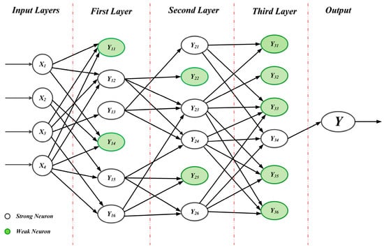 White neurons are strong ones, which are transferred to the next layer. On the other hand, green neurons can be represented as weak ones, which are eliminated after an accuracy assessment. GMDH neural networks generally utilize least squares regression to determine the optimal analytic relation between the input variables and target variables, using a reference function that can be shown in Equation (3) [31].