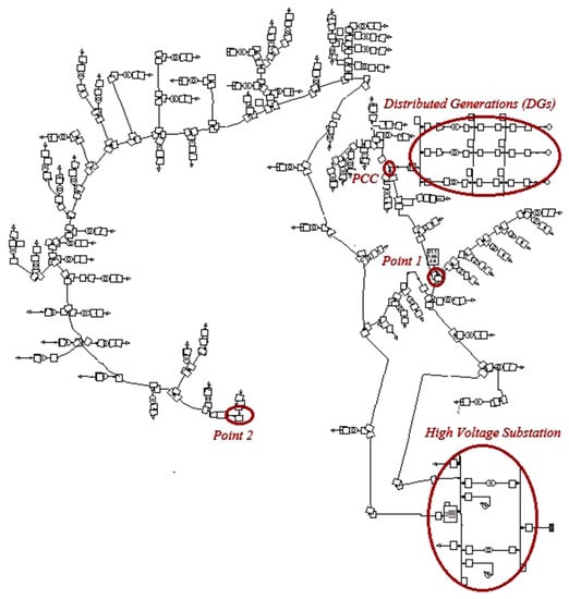 Distributed generations (DGs) have significantly changed many features of power systems, such as reducing network losses, voltage profiles, and serving as back-ups, etc. [1,2,3]. Although DGs can improve some electrical parameters, they may cause several types of problems in power systems [4]. These problems have direct effects on the conventional protection schemes in active distribution networks (ADNs). Blinding protection areas [5], sympathetic tripping (the false tripping of feeders) [6], and failures of the auto-reclosers [7] are the main challenges that are created by the presence of DG units in distribution networks. Blinding zones cause the relay to operate with a delay or non-tripping [8,9]. Protective relays are not able to detect faults in the blinding mode. Indeed, when the short circuit of the feeders is smaller than the pickup current of the protective relays, the protection system is under a blinding area [10]. In sympathetic tripping, the fault current feeds from more than one direction due to the presence of DGs.