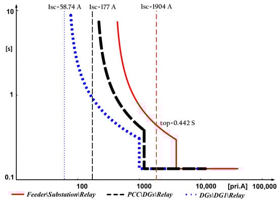OC relay characteristic curves of substation 20 kV main feeder, PCC, and DG1—ring situation (fault at Point 2).