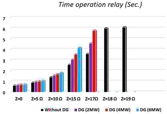 Figure 7 and Table 4 illustrate the feeder operating times of the OC protective relay with different fault impedances and DG capacities at the ring situation in the case of a fault occurring at Point 2. The relay cannot detect a fault with more than 15 Ω fault resistance and 6 MW DGs.