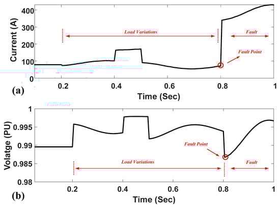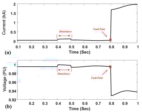 Figure 9 shows the current and voltage of the main feeder during the fault at Point 1 with a 4 MW DG capacity. The short-circuit current is around 1.95 kA with a 5 Ω impedance fault, as shown in Figure 9a. All the faults are initiated at 0.8 s. The voltage level of the busbar decreases by around 0.07 pu during the fault, as illustrated in Figure 9b. The different load variations and the change in the operational mode (the ring connection of two feeders) are considered as disturbances in order to reveal the performance of the proposed fault detection method.