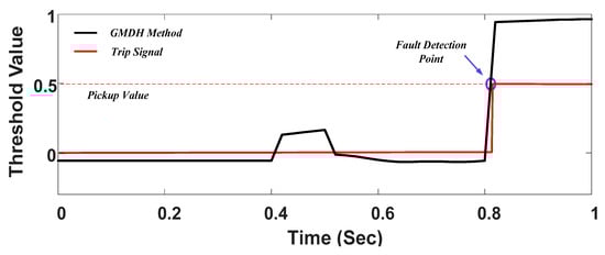 Figure 12 shows the performance of the proposed method with the fault at Point 1. The threshold value is considered as 0.5, and the fault detection time is observed around 20 ms with a short-circuit current around 448 A under a 25 Ω impedance fault case. The various load variations with the different DG capacities and the ring connection of two feeders (as disturbances) are considered in order to conduct a performance evaluation of the proposed ML fault detection method. The proposed method has a high-speed operation in comparison to conventional OC relays. The operation time of the conventional OC relay is more than 6 s with the same short-circuit level as that shown in Figure 6.