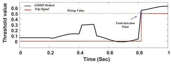Figure 10 displays the performance of the proposed method during the fault induced at Point 1 with a 4 MW DG capacity and 5 Ω impedance fault. In this case, the threshold value is considered as 0.5 and the fault detection time is obtained around 20 ms. The proposed method has a high-speed operation in comparison to conventional OC relays. The operation time of the conventional OC relay is more than 435 ms with the same short-circuit level, as shown in Table 3.