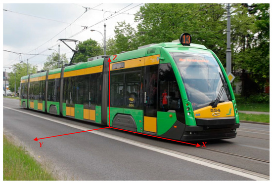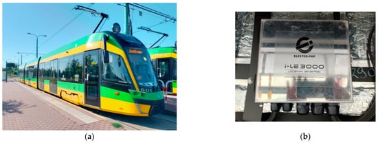 All tests were carried out in the city of Poznań (Poland), during normal tram rides with passengers. The device was tested in two Solaris Tramino S105p trams (Figure 5) belonging to the Poznań Municipal Transport Company (MPK Poznań Sp. z o.o.).