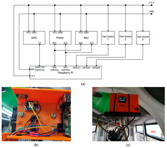 The TDTAS prototype: (a) electrical diagram, (b) interior with a visible Raspberry Pi minicomputer (on the right), (c) tests in the Solaris Tramino S105p tram (power bank is visible under the device).