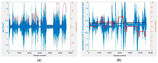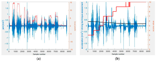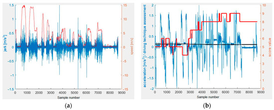 X-axis measurement results (traveling the same section in the opposite direction): (a) jerk (m/s3) (blue) and velocity (m/s) (red), (b) acceleration (m/s2) (blue), evaluation algorithm value (black) and algorithm scoring (red).