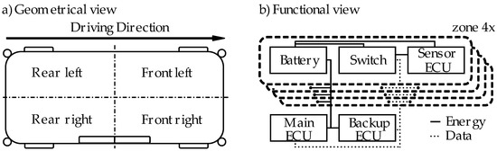 Figure 1 shows the geometrical and the functional view of the UNICARagil vehicle architecture. Figure 1a displays the geometrical view with the separation into four zones. The functional architecture with the components and their interfaces is shown in Figure 1b. In the UNICARagil project, the research consortium designed and built a platform for four autonomous vehicles [29,30,31,32]. This platform corresponds to a four-zone architecture, but without fully comprehensive zone controllers, as they were not available at the beginning of the project. Instead, the vehicle uses one sensor module per zone to process data from the optical sensors, one switch to connect components to the Ethernet network, and one battery including the power distribution unit (PDU) to supply the components in the zone. In addition to a reduction of the wiring harness weight, the zonal architecture has positive effects on safety, modularity, and offers new degrees of freedom in packaging [33]. To ensure the safety of the vehicle in the event of a driver absence, additional hardware is required, which is best provided in separate zones. Considering the increasing number of variants, modularity is an important factor. Interchangeable zones make the diversity of variants more manageable in terms of hardware and software. Efficient packaging leads to more cabin volume that is available for passengers. Furthermore, it offers additional degrees of freedom in the development of the overall vehicle, especially in the integration of other systems. In addition to handling the complexity of the system, freedom in packaging as well as a high degree of modularity reduces development time and lower costs.
