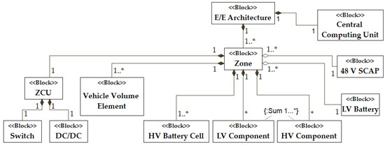 For generating a three-dimensional grid of nodes and edges, the outer shell and dimensions of the passenger cabin are needed. This forms the basis of the geometric modeling. The nodes correspond to discrete points in the vehicle architecture, and the edges connect them according to the graph theory. After the removal of unused nodes or edges, the remaining ones are available to the algorithm. The electrical components are mapped to the node closest to their coordinates. The mapping of the other systems is performed according to the position and the energy demand of their assigned electronic components. Both sets of information are available, albeit with limited accuracy, prior to the elaboration of the systems. In the following, the set of available edges, nodes, and the power and position of the electrical loads is called the structure. In addition to the geometric representation, an electrical one is necessary, defining the energy and information flows in the architecture. Since it is not clear yet how the interface design of ZCUs will look, the architecture specified in Figure 3 is assumed. It shows a block definition diagram using the system modeling language (SysML). The E/E architecture is based on one or more zones. Each zone requires a ZCU, which incorporates a DC/DC converter and a switch, at least one HV battery cell, and electric components. The number of HV battery cells is proportional to the electric power consumption in a zone and thus also proportional to the number of electrical loads.
